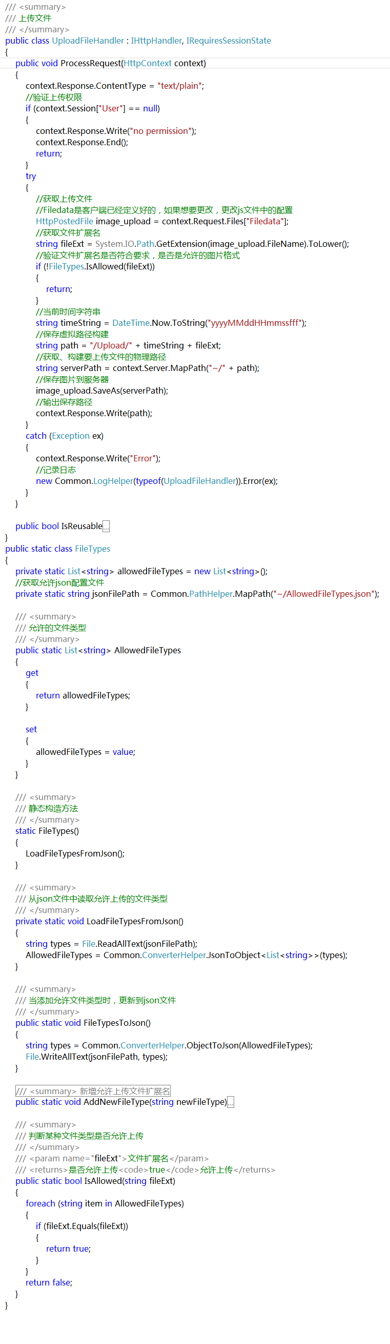 1 2 3 4 5 6 7 8 9 10 11 12 13 14 15 16 17 18 19 20 21 22 23 24 25 26 27 28 29 30 31 32 33 34 35 36 37 38 39 40 41 42 43 44 45 46 47 48 49 50 51 52 53 54 55 56 57 58 59 60 61 62 63 64 65 66 67 68 69 70 71 72 73 74 75 76 77 78 79 80 81 82 83 84 85 86 87 88 89 90 91 92 93 94 95 96 97 98 99 100 101 102 103 104 105 106 107 108 109 110 111 112 113 114 115 116 117 118 119 120 121 122 123 124 125 126 127 128 129 /// <summary> /// 上傳文件 /// </summary> public class UploadFileHandler : IHttpHandler, IRequiresSessionState { public void ProcessRequest(HttpContext context) { context.Response.ContentType = "text/plain"; //驗證上傳權(quán)限 if (context.Session["User"] == null) { context.Response.Write("no permission"); context.Response.End(); return; } try { //獲取上傳文件 //Filedata是客戶端已經(jīng)定義好的,如果想要更改,更改js文件中的配置 HttpPostedFile image_upload = context.Request.Files["Filedata"]; //獲取文件擴(kuò)展名 string fileExt = System.IO.Path.GetExtension(image_upload.FileName).ToLower(); //驗證文件擴(kuò)展名是否符合要求,是否是允許的圖片格式 if (!FileTypes.IsAllowed(fileExt)) { return; } //當(dāng)前時間字符串 string timeString = DateTime.Now.ToString("yyyyMMddHHmmssfff"); //保存虛擬路徑構(gòu)建 string path = "/Upload/" + timeString + fileExt; //獲取、構(gòu)建要上傳文件的物理路徑 string serverPath = context.Server.MapPath("~/" + path); //保存圖片到服務(wù)器 image_upload.SaveAs(serverPath); //輸出保存路徑 context.Response.Write(path); } catch (Exception ex) { context.Response.Write("Error"); //記錄日志 new Common.LogHelper(typeof(UploadFileHandler)).Error(ex); } } public bool IsReusable { get { return false; } } } public static class FileTypes { private static List<string> allowedFileTypes = new List<string>(); //獲取允許json配置文件 private static string jsonFilePath = Common.PathHelper.MapPath("~/AllowedFileTypes.json"); /// <summary> /// 允許的文件類型 /// </summary> public static List<string> AllowedFileTypes { get { return allowedFileTypes; } set { allowedFileTypes = value; } } /// <summary> /// 靜態(tài)構(gòu)造方法 /// </summary> static FileTypes() { LoadFileTypesFromJson(); } /// <summary> /// 從json文件中讀取允許上傳的文件類型 /// </summary> private static void LoadFileTypesFromJson() { string types = File.ReadAllText(jsonFilePath); AllowedFileTypes = Common.ConverterHelper.JsonToObject<List<string>>(types); } /// <summary> /// 當(dāng)添加允許文件類型時,更新到j(luò)son文件 /// </summary> public static void FileTypesToJson() { string types = Common.ConverterHelper.ObjectToJson(AllowedFileTypes); File.WriteAllText(jsonFilePath, types); } /// <summary> /// 新增允許上傳文件擴(kuò)展名 /// </summary> /// <param name="newFileType"></param> public static void AddNewFileType(string newFileType) { AllowedFileTypes.Add(newFileType); FileTypesToJson(); } /// <summary> /// 判斷某種文件類型是否允許上傳 /// </summary> /// <param name="fileExt">文件擴(kuò)展名</param> /// <returns>是否允許上傳<code>true</code>允許上傳</returns> public static bool IsAllowed(string fileExt) { foreach (string item in AllowedFileTypes) { if (fileExt.Equals(fileExt)) { return true; } } return false; } }新聞熱點