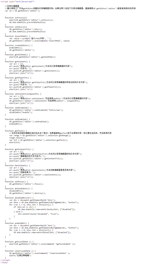 添加zh-cn.js文件是要設置語言,防止自動識別語言錯誤而導致語言適配錯誤,UEditorHelper.js文件是一些常用的方法和編輯器設置的封裝,查看index.html的源代碼,在其中有一段js代碼