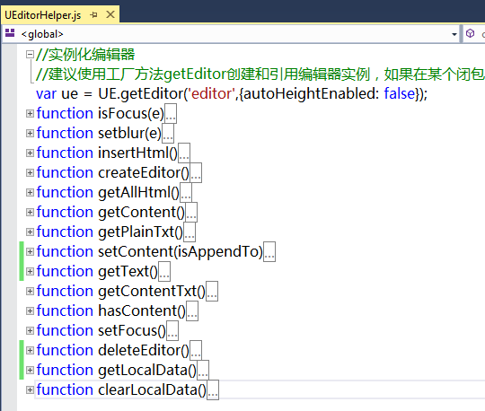 我在我的項目中新建了一個ueditorHelper.js文件,在文件中定義了一些ueditor常用的方法,以及對于ueditor的一些設置