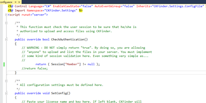 打開ckfinder目錄下的config.ascx,第一個方法是驗證授權的,看用戶是否有權限上傳文件,可以通過驗證 session,驗證用戶是否被授權,默認是return false;如果不加修改,直接使用在上傳時會報錯,沒有授權無法上傳,如果測試階段可以直接改為return true; 但發布的話最好要驗證權限,不要直接return true(我在這里驗證用戶是否已經登錄,如果登錄則返回true,否則返回false)