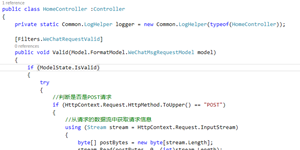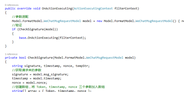 1 2 3 4 5 6 7 8 9 10 11 12 13 14 15 16 17 18 19 20 21 22 23 24 25 26 27 28 29 30 31 32 33 34 35 36 37 38 39 40 41 public class WeChatRequestValidAttribute : ActionFilterAttribute { private const string Token = "StupidMe"; public override void OnActionExecuting(ActionExecutingContext filterContext) { //參數(shù)適配 Model.FormatModel.WeChatMsgRequestModel model = new Model.FormatModel.WeChatMsgRequestModel() { nonce= filterContext.HttpContext.Request.QueryString["nonce"],msg_signature= filterContext.HttpContext.Request.QueryString["msg_signature"],timestamp=新聞熱點
