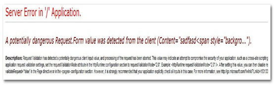 這是因?yàn)锳SP.NET默認(rèn)開啟對(duì)頁面提交內(nèi)容的驗(yàn)證(不僅是ASP.NET MVC,WebForms也默認(rèn)啟用對(duì)頁面提交的內(nèi)容進(jìn)行驗(yàn)證),解決這個(gè)問題的關(guān)鍵就在于在有富文本編輯器的頁面或者會(huì)有提交html代碼的頁面關(guān)閉驗(yàn)證,可大致分為以下三種情況: