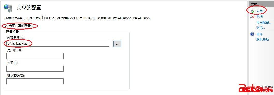 4、把“啟用共享的配置”勾選上,物理路徑就選擇你備份的文件所在目錄,用戶(hù)名、密碼輸入框都不需要填寫(xiě),直接點(diǎn)擊右上方的應(yīng)用,然后它要你輸入密碼,確定后重啟下我們的IIS 就可以看到以前的站點(diǎn)信息都還原了。