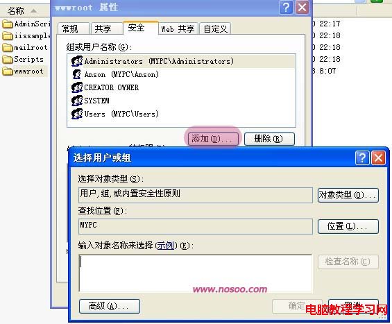 5.在"安全"選項卡下,點擊"添加……",跳出"選擇用戶和組"對話框