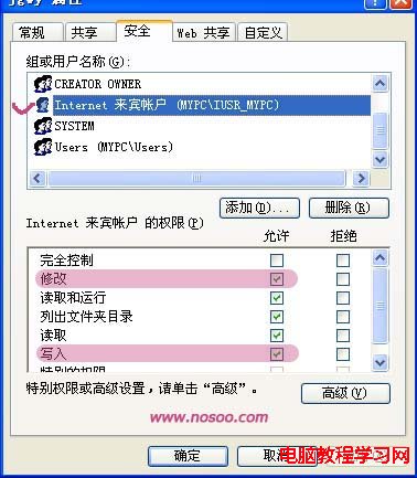 7.之后在"安全"選項卡中就會出現"Internet來賓帳戶",將這個帳戶的權限設置為"可修改"和"可寫入"