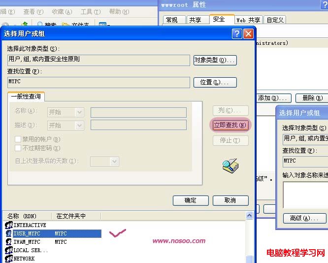 6.然后點擊"立即查找",在下圖所示的列表中選擇"IUSR_"(下劃線之后是你的計算機名)