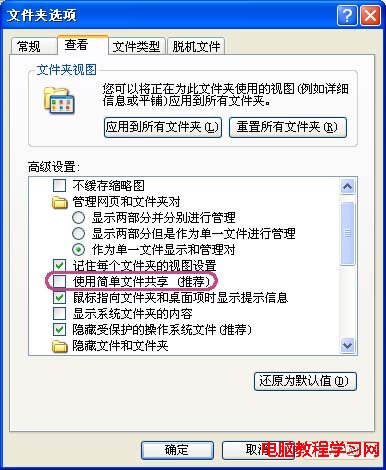 3.在"查看"選項卡中不鉤選"使用簡單文件共享"