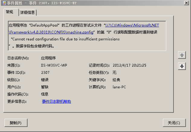 近日在win7的IIS7.5上部署ASP.NET4.0 程序時,發現瀏覽網頁都出現錯誤代碼為"503“的錯誤,但是我已經將對應用程序部署到IIS上了,怎么會出現找不到頁面的情況呢?開始以為是ASP.Net 環境沒有安裝到IIS7.5中,執行了幾遍ASPNET_REGIIS -i都還是一樣,結果查看ASP.NET應用程序使用的【應用程序池】-DefaultAppPool停止了,于是我馬上啟動,但是馬上它有恢復成【停止】狀態: