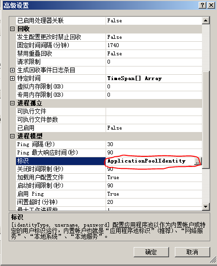 于是看了一下【應用程序池】的【高級設置】中的【進程模型】的【標識】設置的是“ApplicationPoolIdentity”,對于此設置的說明,參考了:http://www.jb51.net/article/65315.htm如下: