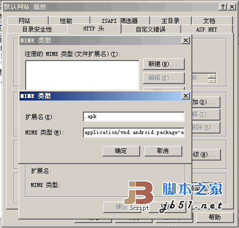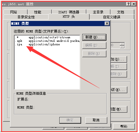 單擊MIME類型下的“MIME類型”按鈕,打開MIME類型設置窗口; 單擊“新建”,建立新的MIME類型; 擴展名中填寫“.apk”,MIME類型中填寫apk的MIME類型“ application/vnd.android.package-archive ”