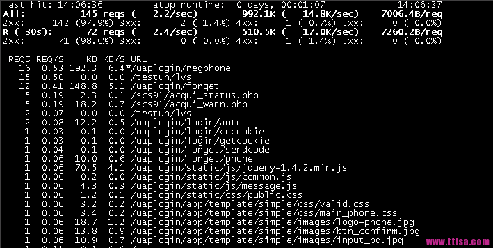 apachetop也可以實時監測nginx日志,不過nginx訪問日志格式必須是通用或聯合日志格式,否則有些信息統計不到。