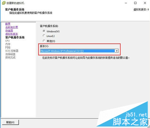 進入“客戶機操作系統”界面,選擇“客戶機操作系統”和“版本”,這里我創建的是xp系統,然后點擊“下一步”按鈕。