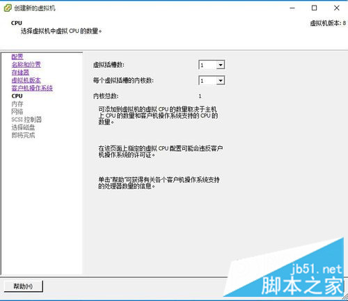 進入“CPU”界面,選擇虛擬插槽數及每個虛擬插槽的內核數,一般默認就可,如果主機夠強悍,想使虛擬機運行更快,可以自行根據實際情況配置,然后點擊“下一步”按鈕。