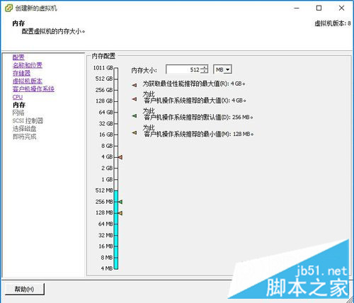 進入“內存”界面,選擇虛擬機的內存,建議是2的n次方數,然后點擊“下一步”按鈕。