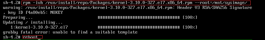 10、安裝kernel包,需要注意的是,當前并不是根的位置,如上圖,根的位置顯示為/mnt/sysimage,所以需要指定根的位置,完成后,重新啟動即可。