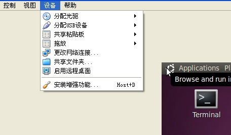 解決方法:在VirtualBox菜單欄中選擇【設(shè)備】->【安裝增強(qiáng)功能】