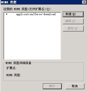 點(diǎn)擊 MIME類型進(jìn)行修改擴(kuò)展名,現(xiàn)在為了實(shí)現(xiàn)所有的文件都提示下載,擴(kuò)展類就輸入了一個(gè) * 字符,MIME類型本來是想填寫application/octet-stream,想將所有的文件類型當(dāng)做EXE來下載,但無效。 最后,在翻查了微軟的官方資料得知,加上application/force-download這個(gè)類型!