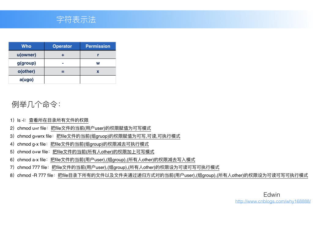 5)chmod o+w file:把file文件的當(dāng)前(所有人other)的權(quán)限加上可寫模式
