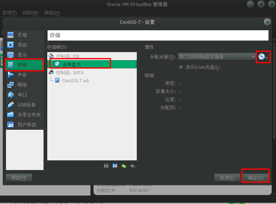 然后在選中存儲,單擊沒有碟片,點擊右邊的光盤圖標,選擇你之前下載好的CentOS-7系統鏡像打開。