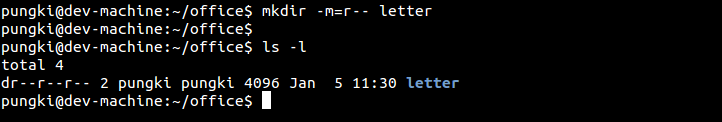 上面的命令會創建一個名為 letter 的目錄,同時為目錄所有者、用戶組和其他用戶針對該目錄賦予只讀權限