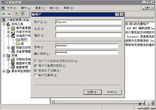 2.下面就到了該對SERV-U進行安全設置的時候了。首先建立一個WINDOWS賬號(例如ftptest,密碼設置復雜些)