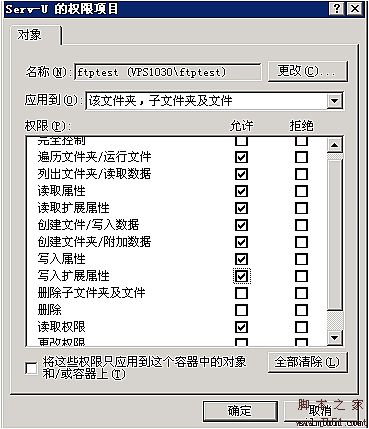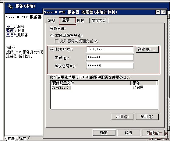 現在,在服務里重啟Serv-U FTP Server服務就可以正常啟動了。當然,到這里還沒有完全設置完,你的FTP用戶因為沒有權限還是登錄不了的,所以還要設置一下目錄的權限7.假設你有一個WEB目錄,路徑是d:/web。那么在這個目錄的“安全設定”里除了管理員和IIS用戶都刪除掉,再加入ftptest賬號,切記SYSTEM賬號也刪除掉。為什么要這樣設置呢?因為現在已經是用ftptest賬號啟動的SERV-U,而不是用SYSTEM權限啟動的了,所以訪問目錄不再是用SYSTEM而是用ftptest,此時SYSTEM已經沒有用了,這樣就算真的溢出也不可能得到SYSTEM權限。另外,WEB目錄所在盤的根目錄還要設置允許ftptest賬號的瀏覽和讀取權限(除了完全控制,更改權限,取得所有權限,遍歷文件夾/運行文件),并確認在高級里設置只有該文件夾