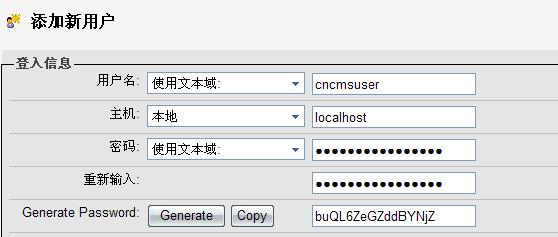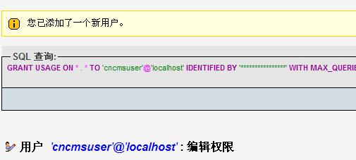 如上圖,我們填寫了用戶名為:cncmsuser,該數據庫用戶只允許本機訪問,主機一項選擇本地;密碼我們使用自動生成的,點下面的“Generate”會生成一個隨機密碼,然后點“Copy”會自動填寫到密碼框中。 下面的框都不選,直接拉到頁面最下面點執行即可創建一個新用戶。 數據庫用戶創建成功,會返回如下頁面: