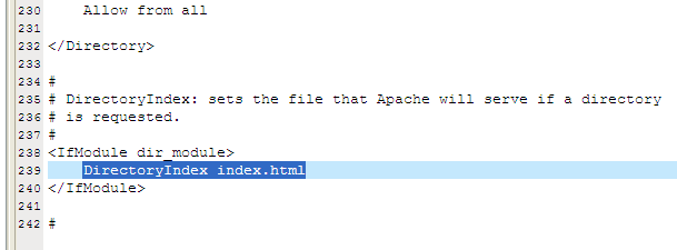 查找關鍵字,DirectoryIndex(目錄索引,也就是在僅指定目錄的情況下,默認顯示的文件名),可以添加很多,系統會根據從左至右的順序來優先顯示,以單個半角空格隔開,比如有些網站的首頁是index.htm,就在光標那里加上“index.htm”文件名是任意的,不一定非得“index.html”,比如“test.php”等,都可以。