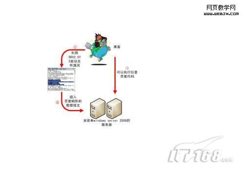 這次導(dǎo)致藍(lán)屏漏洞出現(xiàn)的原因,是一個(gè)名為SRV2.SYS的驅(qū)動(dòng)文件不能正確地處理畸形數(shù)據(jù)結(jié)構(gòu)請(qǐng)求。如果黑客惡意構(gòu)造一個(gè)惡意畸形的數(shù)據(jù)報(bào)文發(fā)送給安裝有Windows Server 2008的服務(wù)器,那么就會(huì)觸發(fā)越界內(nèi)存引用行為,讓黑客可以執(zhí)行任意的惡意代碼(圖1)。