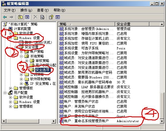 依次展開“Windows設(shè)置→安全設(shè)置→本地策略→安全選項(xiàng)”,并將右邊列表框下拉到最底下,雙擊“重命名系統(tǒng)管理員賬戶”即可更名了。