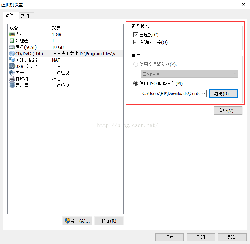 4. 開啟虛擬機后,迅速將虛擬機的光盤設置,改為下面的設置,即勾選“已連接”和“啟動時連接”,如下圖:
