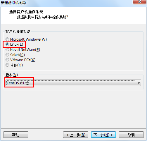 上圖指的是,打算在虛擬機中模擬一個怎樣的操作系統,這里選擇Linux,Version里選擇CentOS 64位,下一步: