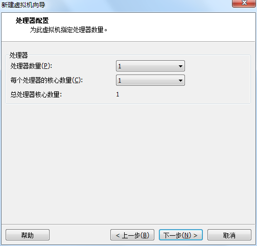 選擇給虛擬機分配的cpu核的數量,如果為虛擬機選擇的cpu數超過本機實際cpu數量,VMware會給出警告。這里選擇默認即可。下一步: