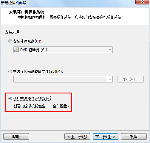 選擇“第三項“稍后安裝操作系統”,以后安裝,方便進行配置。下一步:(注:上圖中,第一項是用光盤安裝,第二項是用硬盤里的ISO鏡像安裝)