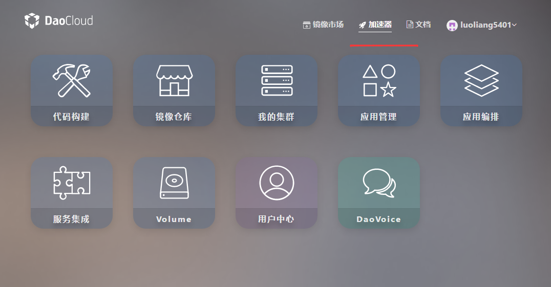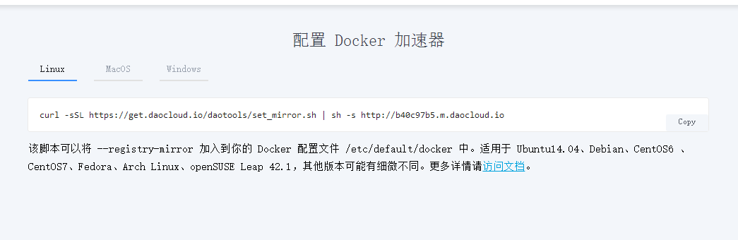 但在pull鏡像的時候卻出現超時無法下載鏡像的問題,估計是國內docker官方鏡像被墻了,網上找了好久發現要使用國內鏡像加速,推薦的有Daocloud和阿里云,我使用的是Daocloud鏡像加速,注冊了賬號之后上方會有一個鏡像加速的超鏈接