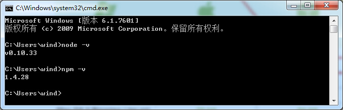 3、 “開始”-->cmd,打開cmd程序,輸入“node -v”,出現” v0.10.33”; 輸入“npm -v”,出現” 1.4.28”,說明Nodejs和npm都已安裝成功。