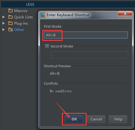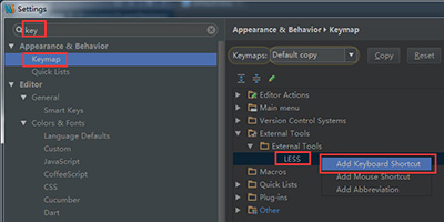 7、在Settings 面板頂端輸入“key”,找到快捷鍵設置項“Keymap”(快捷鍵),在右側找到“External Tools”(外部工具)點開,點選“LESS”并單擊右鍵,選擇“Add Keyboard Shortcut”,在出現其面板的“First Stroke”處同時按下“Alt+B”鍵,這樣就將“Alt+B”設置為將less文件編譯成css文件的快捷鍵。當然你可以根據自己的實際情況設置成其它的快捷鍵。確認好后點Settings 面板右下的“OK”按鈕。