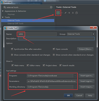 6、File-->Settings(設置),打開設置選項。找到“External Tools”(外部工具)擴展工具設置項,點開右側的“+”,在Name欄輸入“LESS”,“Tool settings”分別輸入如下:
