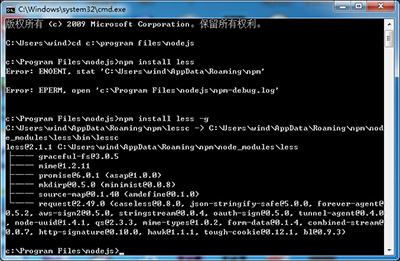 4、“開始”-->cmd,打開cmd程序,輸入“cd C:/Program Files/nodejs”,進入nodejs安裝目錄。輸入npm install less -g 回車,安裝less組件。稍等片刻,完成后,你會發現C:/Users/wind/AppData/Roaming/npm/node_modules 目錄下有less組件。