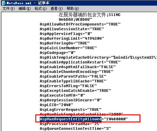 第三步:修改“MetaBase.xml”文件 依次打開“X:/WINDOWS/system32/inetsrv”,在該文件夾中找到“MetaBase.xml”文件,將“MetaBase.xml”用記事本打開,在其中搜索“AspMaxRequestEntityAllowed”,將后面的“204800”改成“1024000000”保存文件。