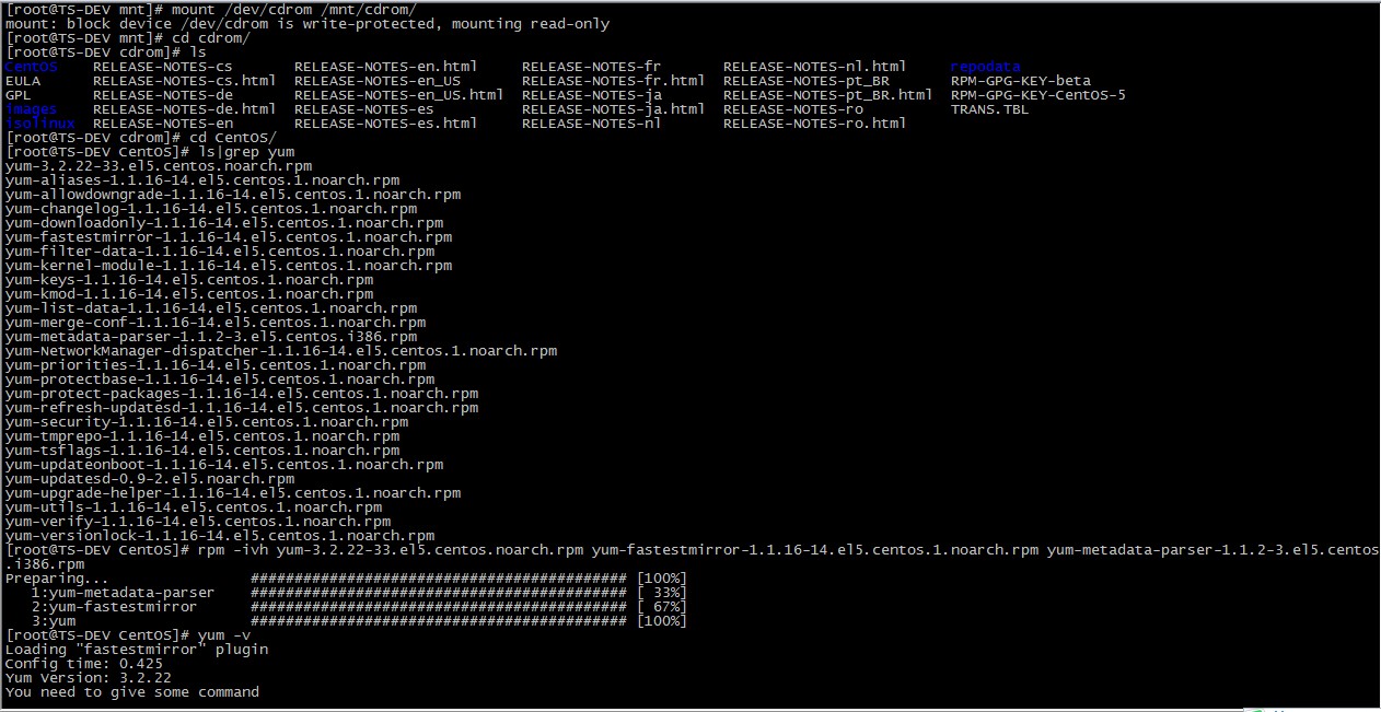 # mount /dev/cdrom /mnt/cdrom/# rpm -ivh yum-3.2.22-33.el5.centos.noarch.rpm yum-fastestmirror-1.1.16-14.el5.centos.1.noarch.rpm yum-metadata-parser-1.1.2-3.el5.centos.i386.rpm# yum -v