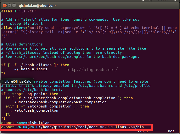 4、添加路徑 進入.bashrc文件,在末尾處添加步驟三的location里的路徑。
