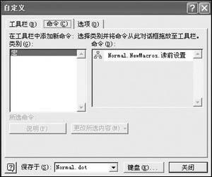 4. 在“自定義”對話框中選擇“命令”選項卡,在“命令”列表框中將顯示輸入的宏名。在該名稱上按下鼠標左鍵將其拖到“常用”工具欄上,這樣工具欄上就多了一個〔讀前設置〕按鈕了。