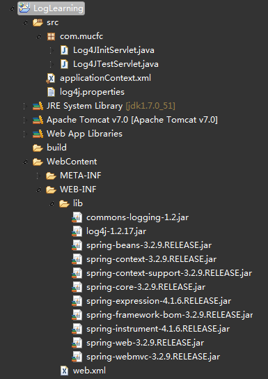 <?xml version="1.0" encoding="UTF-8"?>  <web-app xmlns:xsi="http://www.w3.org/2001/XMLSchema-instance"      xmlns="http://java.sun.com/xml/ns/javaee"      xsi:schemaLocation="http://java.sun.com/xml/ns/javaee http://java.sun.com/xml/ns/javaee/web-app_3_0.xsd"      id="WebApp_ID" version="3.0">      <display-name>LogLearning</display-name>      <servlet>          <servlet-name>Log4JTestServlet</servlet-name>          <servlet-class>com.mucfc.Log4JTestServlet</servlet-class>      </servlet>      <!--用來(lái)啟動(dòng) log4jConfigLocation的servlet -->  <!--     <servlet>          <servlet-name>Log4JInitServlet</servlet-name>          <servlet-class>com.mucfc.Log4JInitServlet</servlet-class>          <init-param>              <param-name>log4j-properties-location</param-name>              <param-value>/WEB-INF/classes/log4j.properties</param-value>          </init-param>          <load-on-startup>1</load-on-startup>      </servlet>-->      <servlet-mapping>          <servlet-name>Log4JTestServlet</servlet-name>          <url-pattern>/test</url-pattern>      </servlet-mapping>           <!-- Spring 容器加載 -->      <listener>          <listener-class>org.springframework.web.context.ContextLoaderListener</listener-class>      </listener>      <context-param>          <param-name>contextConfigLocation</param-name>          <param-value>classpath:applicationContext.xml</param-value>      </context-param>       <!-- 設(shè)置根目錄 -->      <context-param>            <param-name>webAppRootKey</param-name>            <param-value>webapp.root</param-value>        </context-param>        <context-param>          <param-name>log4jConfigLocation</param-name>          <param-value>/WEB-INF/classes/log4j.properties</param-value>      </context-param>      <!-- 3000表示 開一條watchdog線程每60秒掃描一下配置文件的變化;這樣便于日志存放位置的改變 -->      <context-param>             <param-name>log4jRefreshInterval</param-name>             <param-value>3000</param-value>        </context-param>       <listener>          <listener-class>org.springframework.web.util.Log4jConfigListener</listener-class>      </listener>   </web-app>這里L(fēng)og4JInitServlet.java就相當(dāng)于沒(méi)用到了。