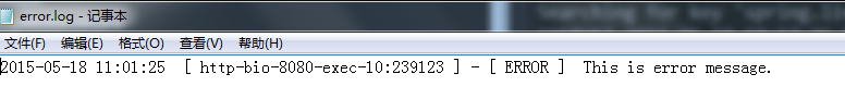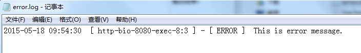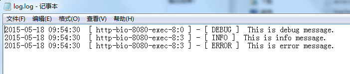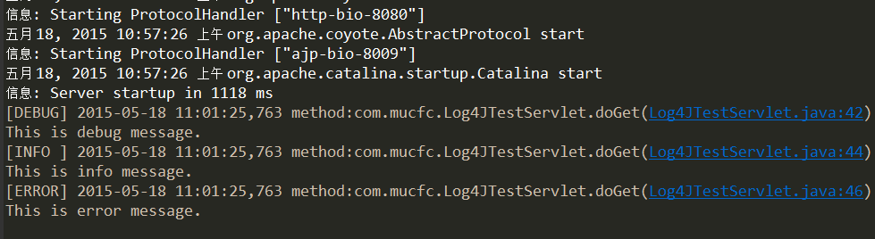 package com.mucfc;  import java.io.IOException;  import javax.servlet.ServletConfig;  import javax.servlet.ServletException;  import javax.servlet.annotation.WebServlet;  import javax.servlet.http.HttpServlet;  import javax.servlet.http.HttpServletRequest;  import javax.servlet.http.HttpServletResponse;  import org.apache.log4j.Logger;  /**  * Servlet implementation class Log4JTestServlet  */  @WebServlet("/Log4JTestServlet")  public class Log4JTestServlet extends HttpServlet {      private static final long serialVersionUID = 1L;      private static Logger logger = Logger.getLogger(Log4JTestServlet.class);        /**      * @see HttpServlet#HttpServlet()      */      public Log4JTestServlet() {          super();          // TODO Auto-generated constructor stub      }      /**      * @see Servlet#init(ServletConfig)      */      public void init(ServletConfig config) throws ServletException {          // TODO Auto-generated method stub      }      /**      * @see HttpServlet#doGet(HttpServletRequest request, HttpServletResponse response)      */      protected void doGet(HttpServletRequest request, HttpServletResponse response) throws ServletException, IOException {          // 記錄debug級(jí)別的信息            logger.debug("This is debug message.");            // 記錄info級(jí)別的信息            logger.info("This is info message.");            // 記錄error級(jí)別的信息            logger.error("This is error message.");        }      /**      * @see HttpServlet#doPost(HttpServletRequest request, HttpServletResponse response)      */      protected void doPost(HttpServletRequest request, HttpServletResponse response) throws ServletException, IOException {          doGet(request,response);      }  }接下來(lái)就是運(yùn)行了,來(lái)看看結(jié)果:
