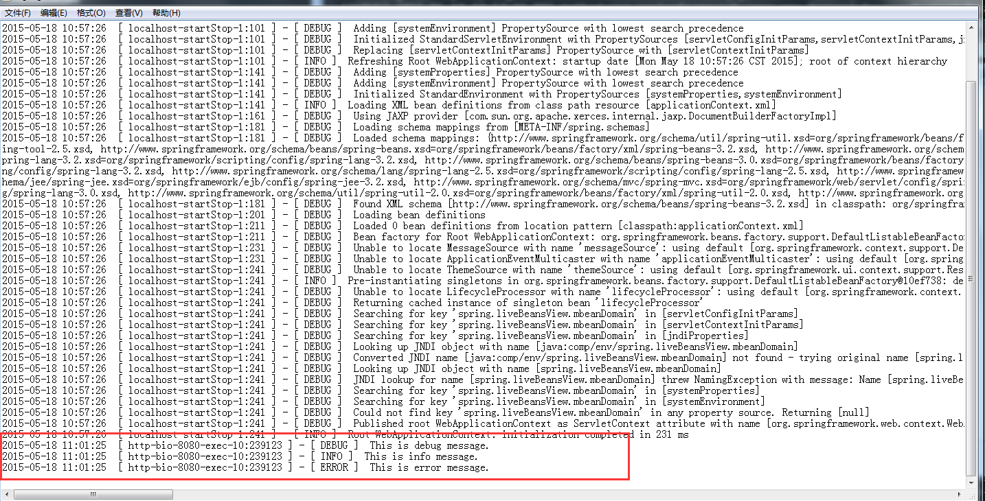 <?xml version="1.0" encoding="UTF-8"?>  <beans xmlns="http://www.springframework.org/schema/beans"      xmlns:xsi="http://www.w3.org/2001/XMLSchema-instance" xmlns:context="http://www.springframework.org/schema/context"      xmlns:aop="http://www.springframework.org/schema/aop"      xsi:schemaLocation="    http://www.springframework.org/schema/beanshttp://www.springframework.org/schema/beans/spring-beans-3.2.xsdhttp://www.springframework.org/schema/aophttp://www.springframework.org/schema/aop/spring-aop-3.2.xsdhttp://www.springframework.org/schema/context           http://www.springframework.org/schema/context/spring-context-3.2.xsd">  </beans>(3)這樣日志就跟隨Spring窗口啟動(dòng)而啟動(dòng)了