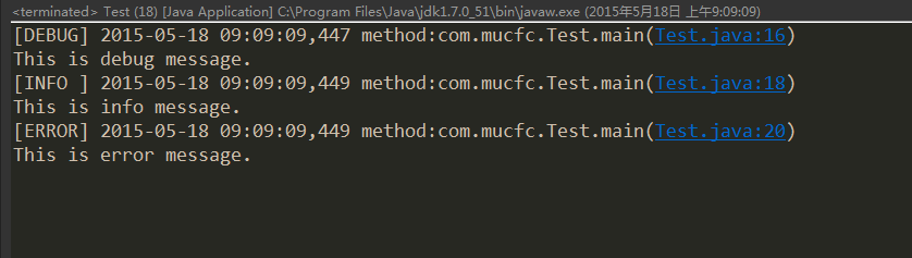 package com.mucfc;import org.apache.log4j.Logger;/** *@author linbingwen *@2015年5月18日9:14:21 */public class Test {    private static Logger logger = Logger.getLogger(Test.class);      /**      * @param args      */      public static void main(String[] args) {          // System.out.println("This is println message.");          // 記錄debug級(jí)別的信息          logger.debug("This is debug message.");          // 記錄info級(jí)別的信息          logger.info("This is info message.");          // 記錄error級(jí)別的信息          logger.error("This is error message.");      }  }4、輸出結(jié)果