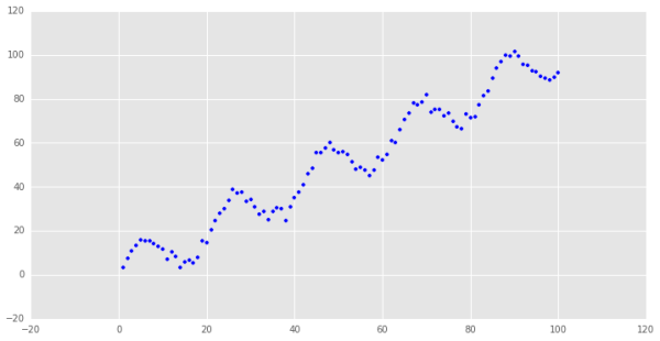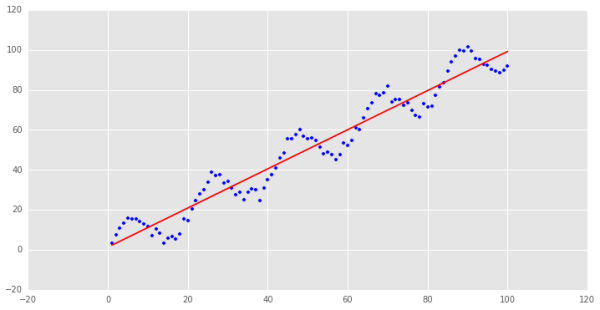 可以看到,要用直線來擬合非線性關系略有牽強,這個例子還算舉的不錯,金融數據里很多時間序列的關系都是非線性的,回歸的結果往往不好.