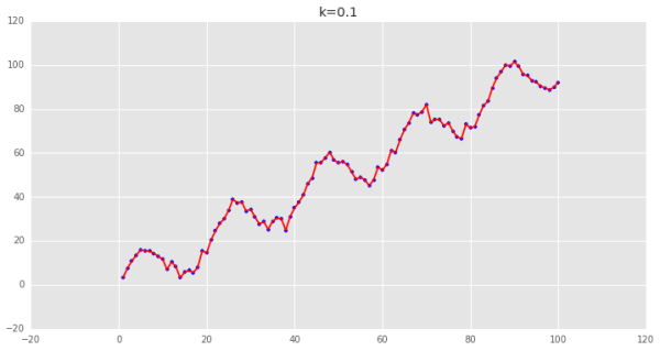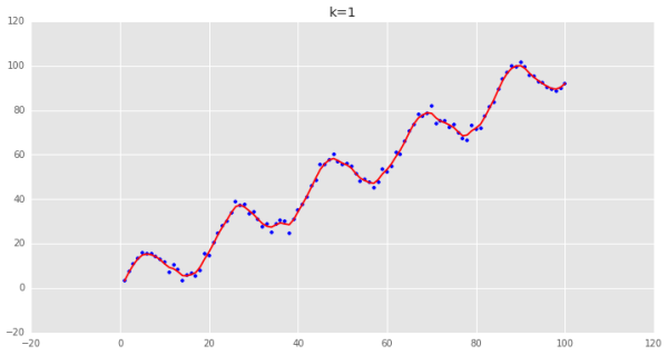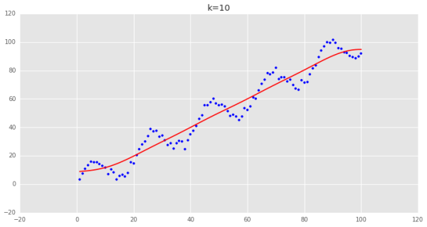 可以看到用普通最小二乘估計出來的值和我們用局部加權估計出來的值非常的一致,說明邏輯是對的。 下面調整一下k的值,來看看各種k值下的擬合狀況: