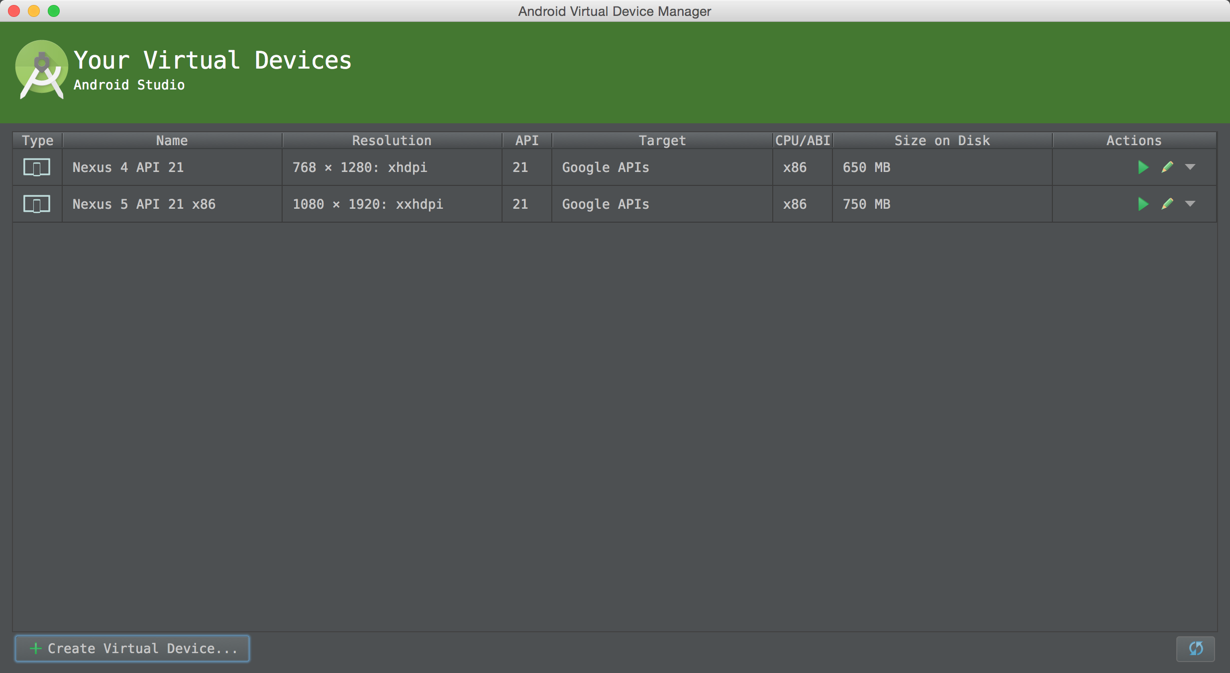 drawable<density>/ - 圖片資源文件layout/ - 用戶界面布局描述文件menu/ - 應用的菜單布局values/ 常量值例如字符串、顏色數值等strings/ 國際化數據Create Virtual Device創建模擬器創建完成后,AVD Manager如下圖: